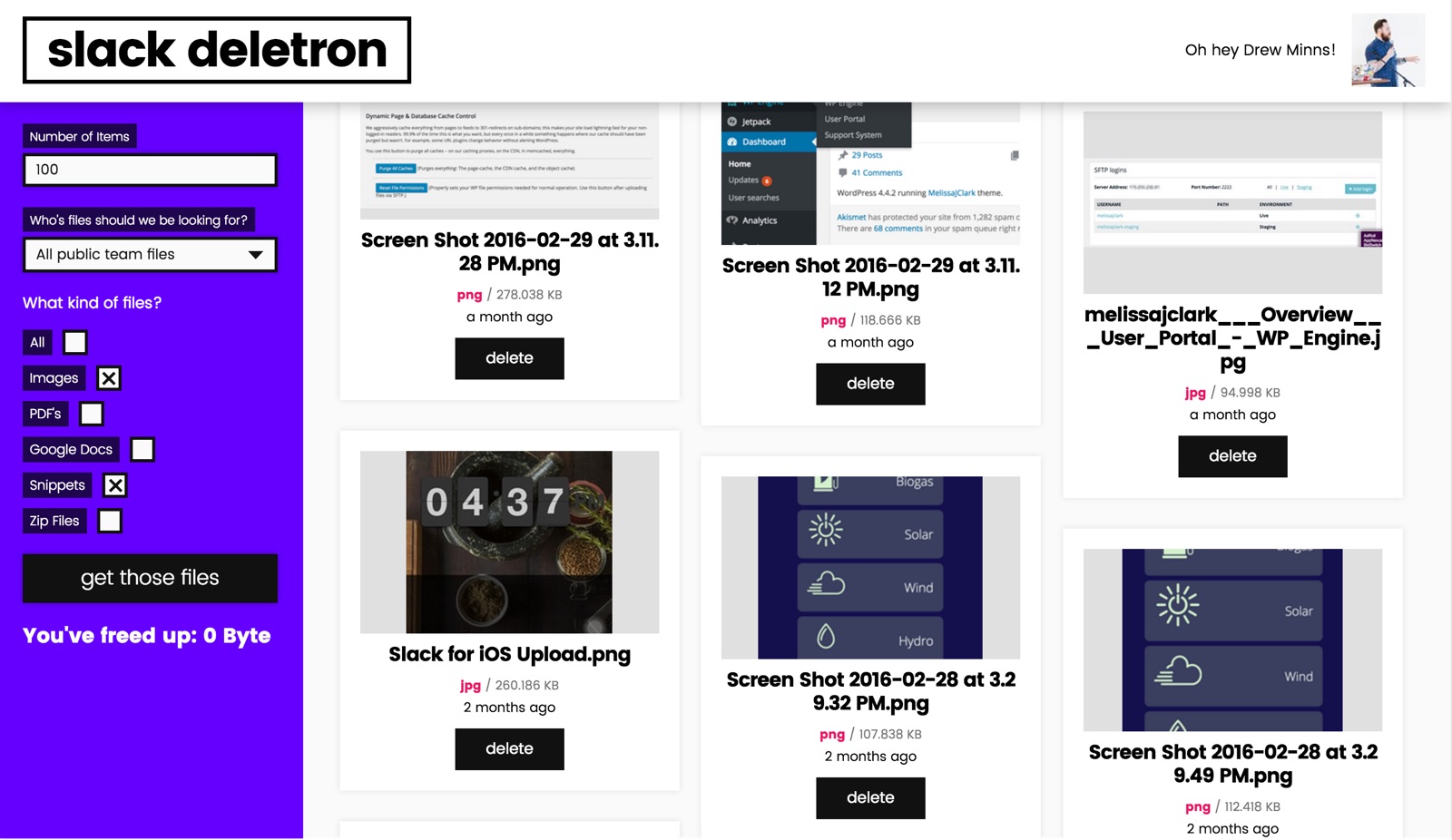 Slack Deletron allows you to search and delete the files that you have put on your Slack team account.